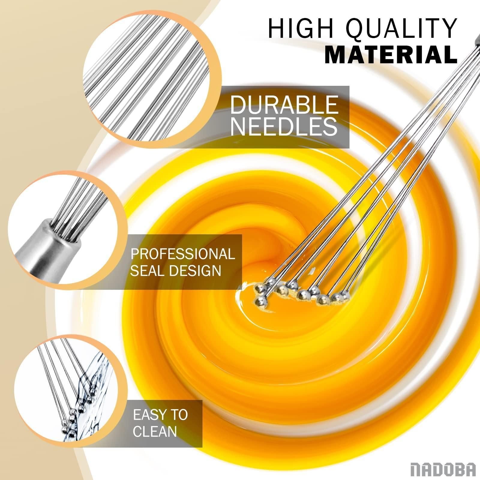 2.unique design of hand mixer whisk: our small whisks for cooking take up less room in your kitchen drawer. the small wire whisk is equipped with 10 semi-rigid wire tines which are designed, increasing the effectiveness and aeration of the mixing motion